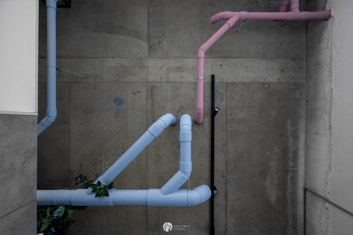 原本裸露的排水管不上包覆反向訂製保留,透過跳色上漆轉為設計亮點,成本低卻創造視覺記憶。