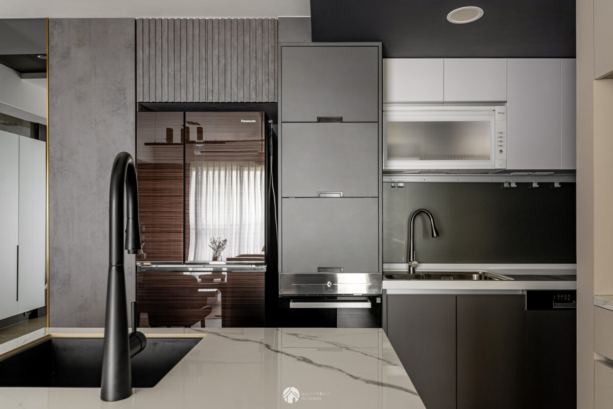 為了讓下方櫥櫃能延伸電器櫃色系,設計師保留原櫃體結構,只更換門片,快速統一空間語彙,兼顧預算與效果。