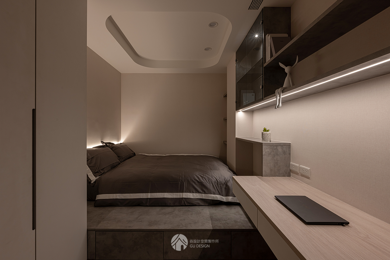 臥室需同時滿足休息與收納需求,若配置不當,容易產生空間壓力。因此利用床下地櫃與層架設計,增加垂直方向的收納容量,將換季衣物與不常使用物品集中收納、維持整齊。
