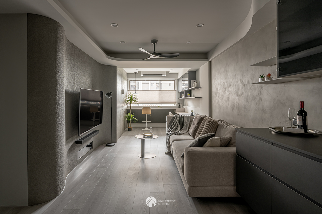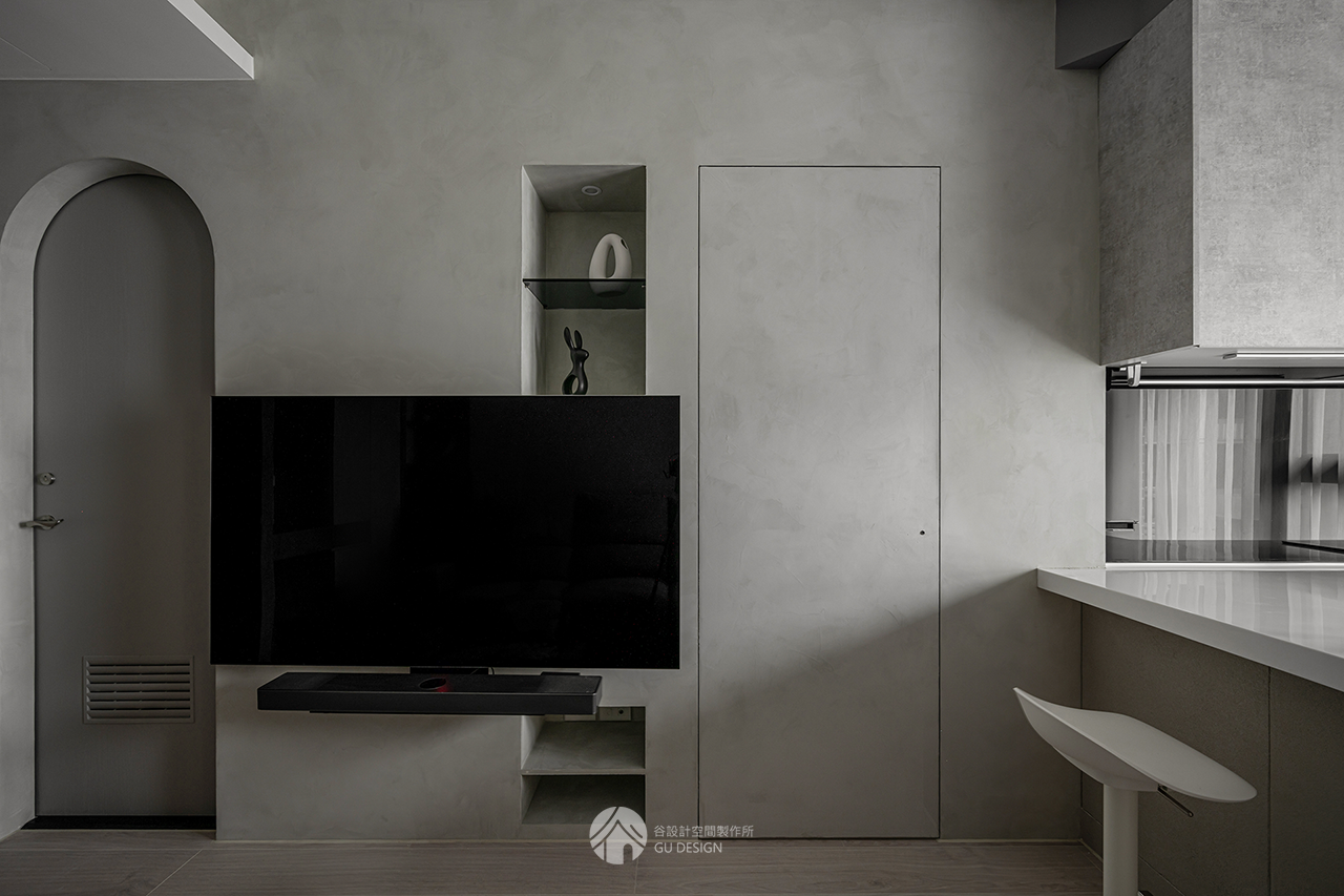 小坪數若收納外露過多,容易形成雜亂的感受。以埋入式壁龕取代電視櫃,視覺上更為簡潔。