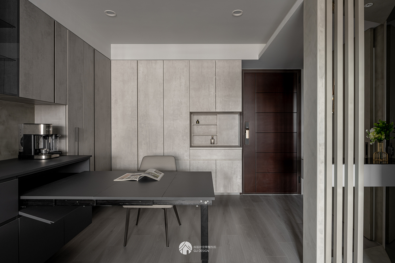 屋主日常多於其他空間用餐,餐桌使用率相對較低,因此採用可收納式餐桌設計,在三五好友到訪時展開使用,平時則可收起維持空間寬敞,提升整體生活彈性與舒適度。