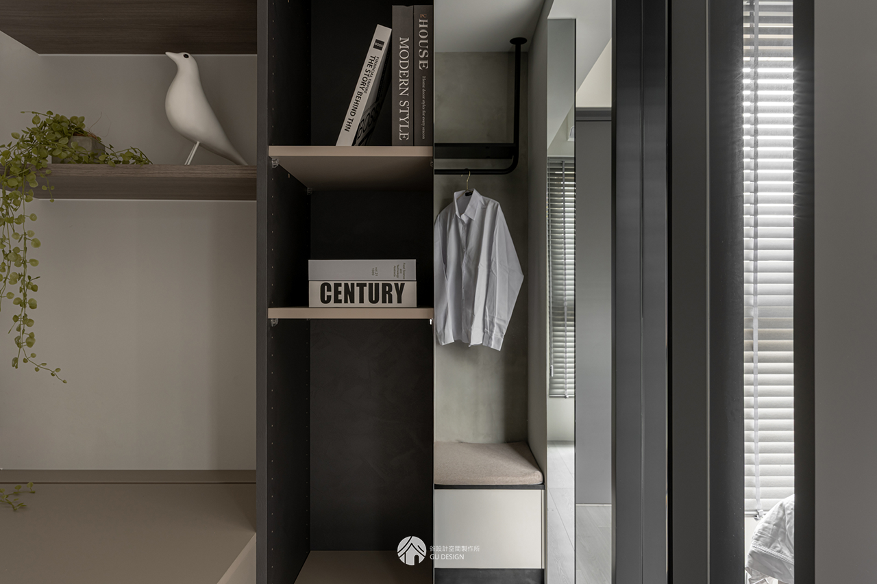 在坪數有限的情況下,將更衣間與書房整合規劃,並利用走道配置吊衣桿與穿鞋椅。