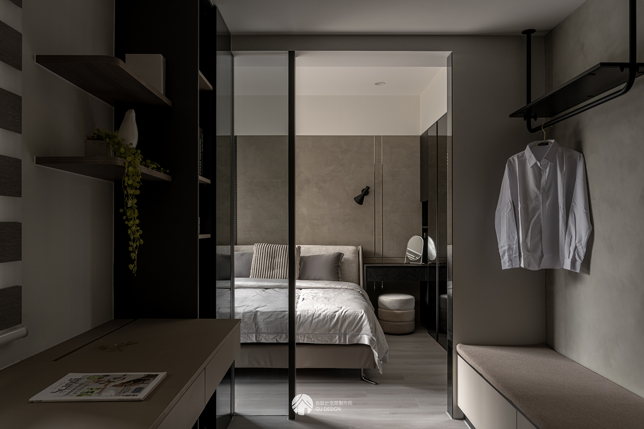 書桌旁放置具有展示、收納功能的鏡面門衣櫃。鏡面既可整理儀容,也有放大空間的效果。
