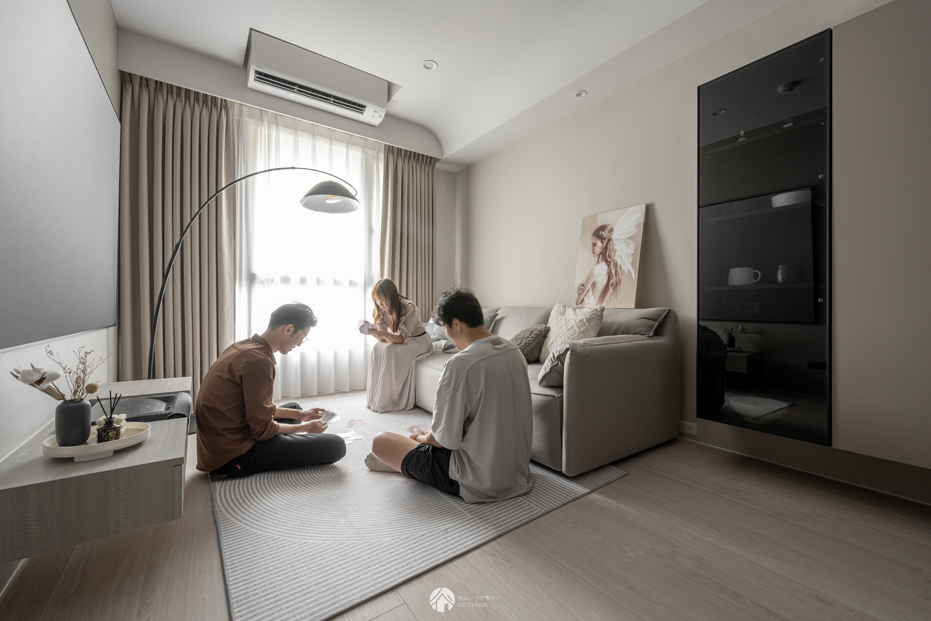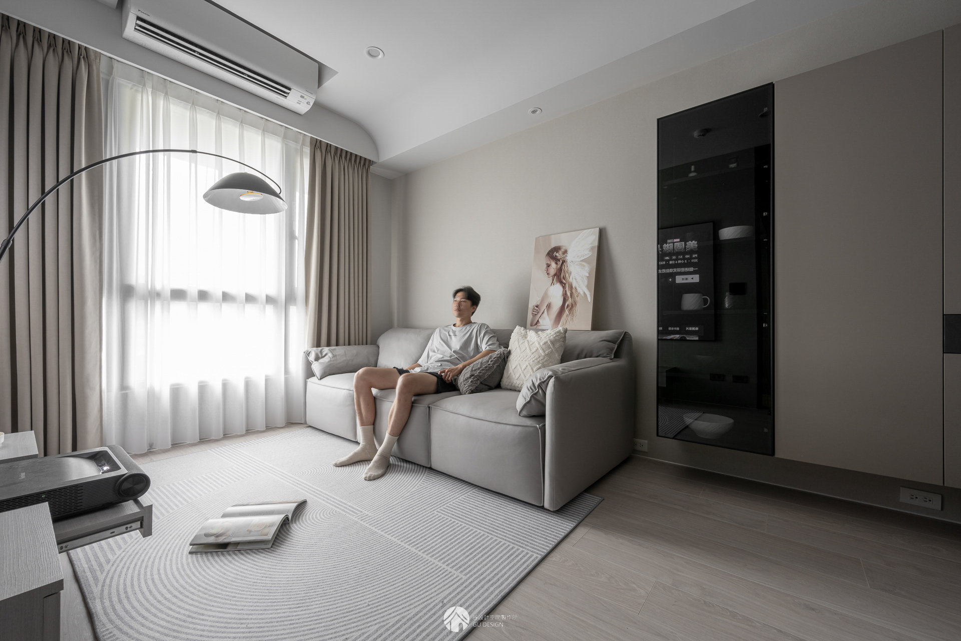 屋主多為一人居住,偶爾有朋友來訪,若客廳擺放過多家具,容易讓空間顯得擁擠、活動受限。因此設計上選擇簡化配置,僅保留一張沙發與地毯,平時可維持舒適的生活品質,朋友來訪時也能彈性使用空間,讓客廳保有開闊感。