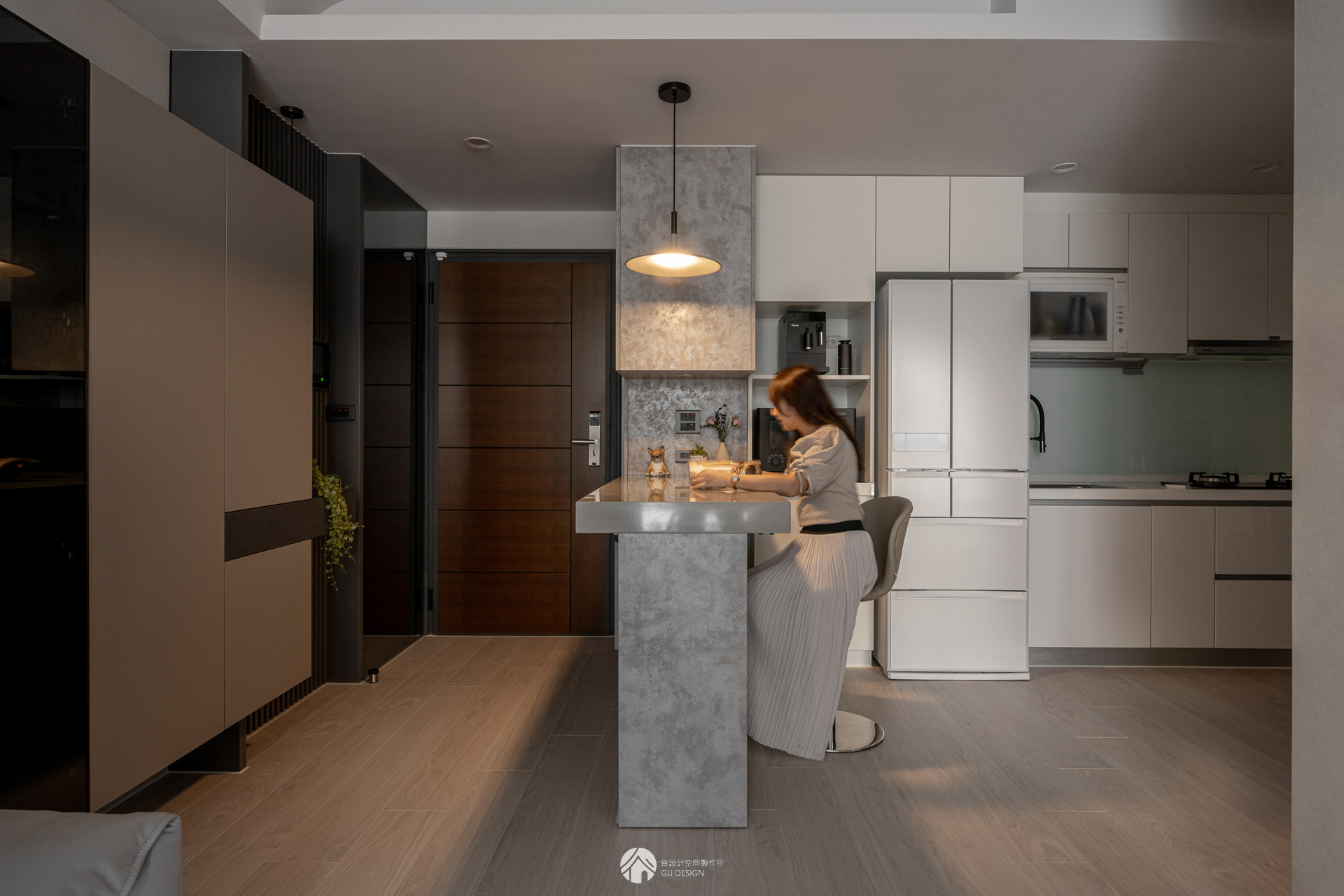 中島、餐桌若各自獨立容易影響動線,因此整合設計,並同時做為餐廳與玄關的分界。
