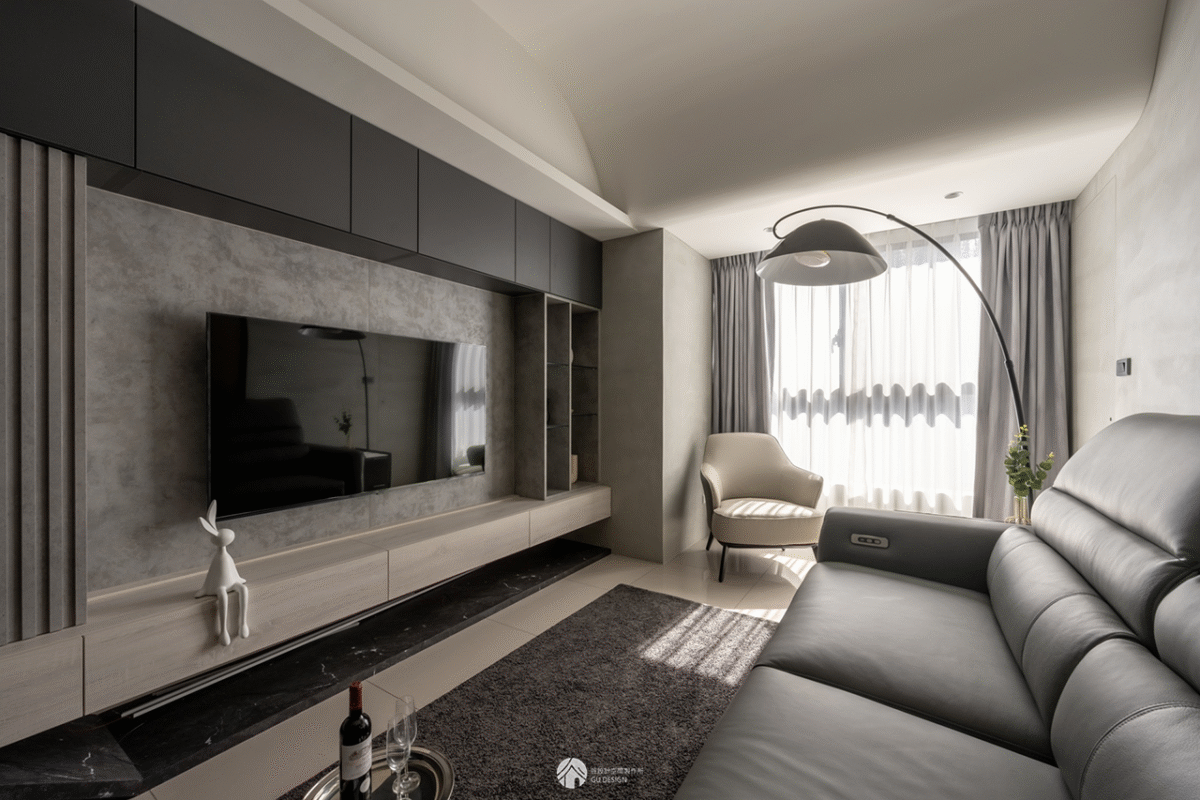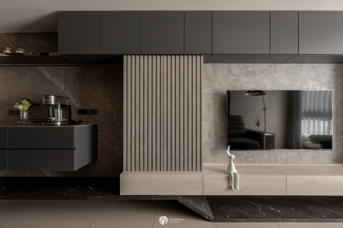 電視櫃採用懸浮式設計,搭配下方大理石斜切飾板與燈帶的展示底座,讓整體畫面輕盈而豐富,黑白對比的俐落線條,融合灰階與木紋材質,堆疊出沉靜並帶有變化的視覺層次。