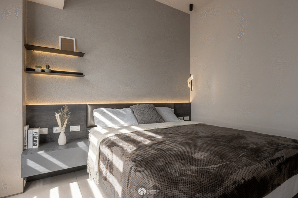床頭背牆融入間接光源,不僅為空間帶來柔和的氛圍,讓整體空間不需多餘燈飾也自帶溫度。