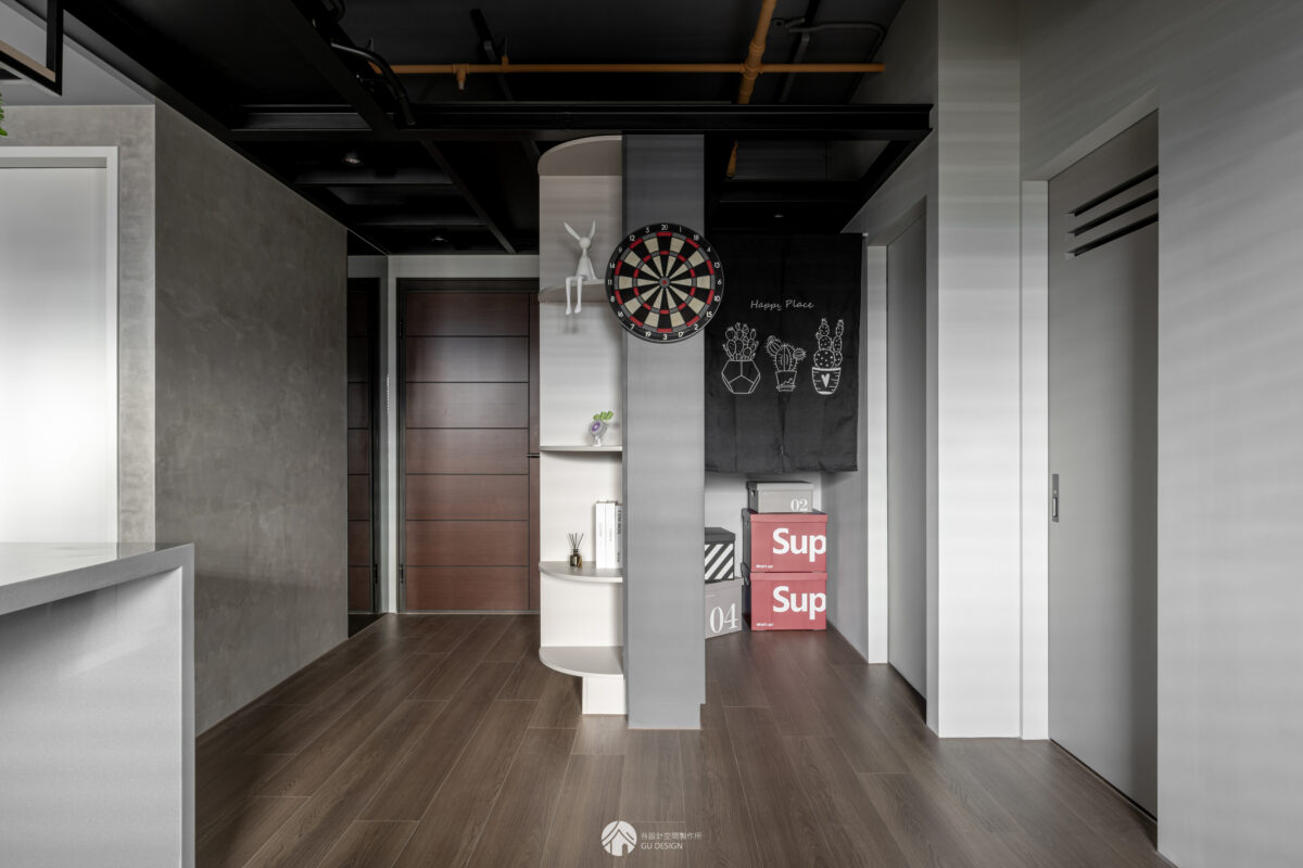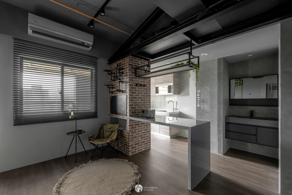 此案是一個小而溫馨的工業風住宅,實坪約為 12 坪,住著熱愛運動與露營的四口之家,屋主的核心需求主要有三項:其一,大量公仔收藏的展示;其二,希望將運動設施整合進日常生活場域;其三,由於一家人每月固定露營一次,帳篷與各式裝備體積龐大,收納規劃成為關鍵課題。因此,在有限空間中,要同時滿足居住機能、運動愛好與家庭娛樂,是本案最重要的目標。