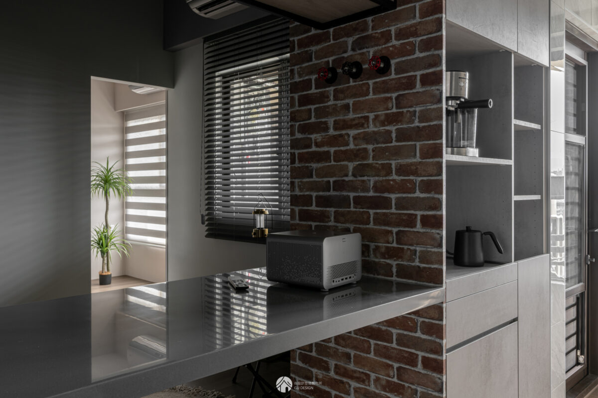 紅磚牆除了營造氛圍外,本身也是一個雙向櫃,面向廚房的一側規劃為電器櫃與零食櫃,收納小家電與食品;另一側面向客廳,增加額外收納容量。透過雙向利用,同一座櫃體承載兩種機能,提升坪效,也讓收納更加集中有序。