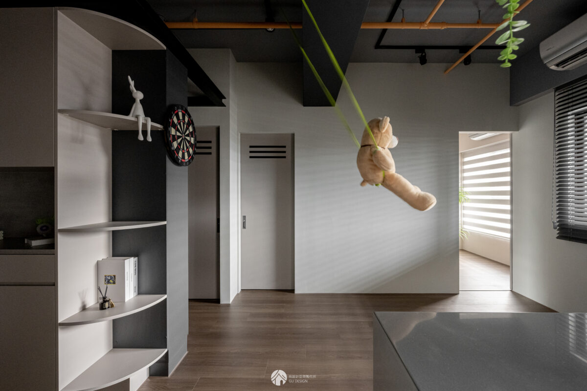 由於空間精巧,且需劃分主臥室、男孩房與女孩房三間獨立房間,設計策略並未著重於私領域的複雜安排,而是將重心放在公領域的整合與放大。設計師保留原始結構,不施作天花板包覆,使管線與樑體自然外露,奠定率性的工業風基礎。同時將 TRX、空中瑜伽、單槓與飛鏢靶融入公共空間,形塑出力量感十足的「工業運動宅」。