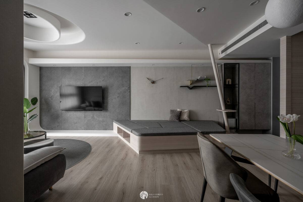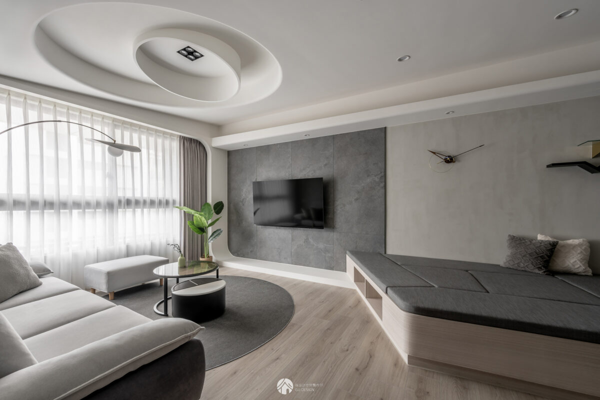 客廳採開放式佈局,保留完整的採光,窗簾設計由左往右收,也有阻擋穿堂煞的作用。窗邊隔板以弧角修飾,串接電視下方和臥榻,增加視覺延伸感,也降低日常碰撞風險,使空間兼具安全性與柔和質感。