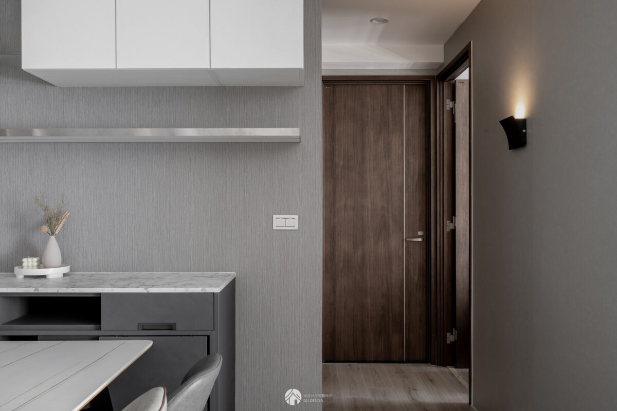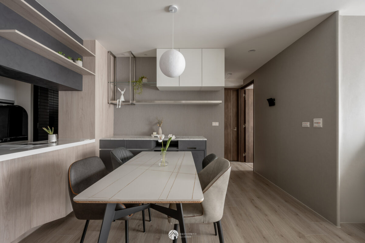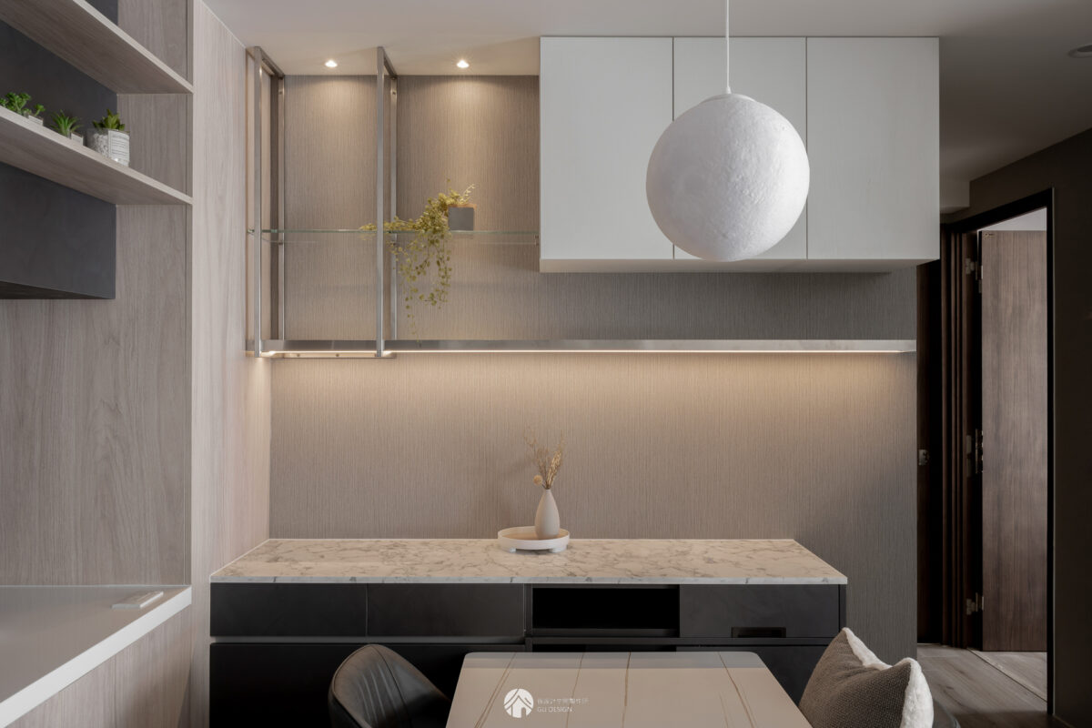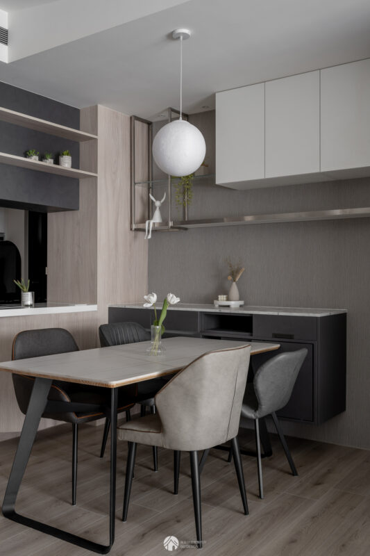 餐桌旁設置餐邊櫃,可收納調味料、水壺、小家電等物品,讓餐桌保持整潔。下層櫃門採用滑門設計,不佔用開闔空間,使用時更為方便。上方則設置吊櫃與展示平台,為空間增添層次,也讓日常所需的物品能自然、有序地被安放。