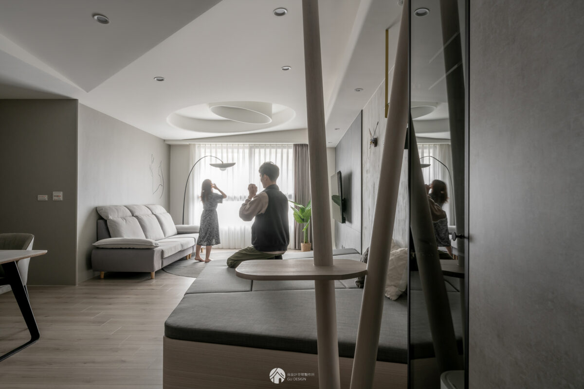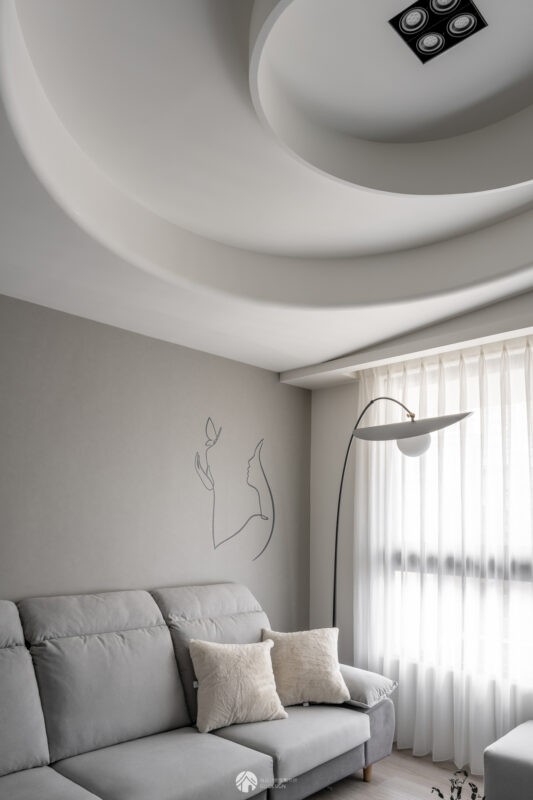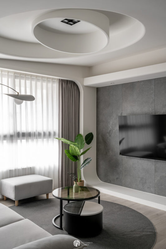 客廳的天花板以「圓形、微傾斜、不對稱」的手法呈現,讓空間產生動態張力,增添活潑感,並有效提高天花板視覺高度。