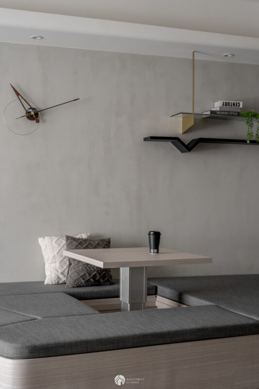 和式桌嵌在臥榻中央,可依需求調整高度,平時維持整片平整的坐榻,在相聚的時刻便緩緩升起,作為用餐、茶敘或遊戲的空間,讓場域保有最大的彈性,輕鬆切換生活模式。