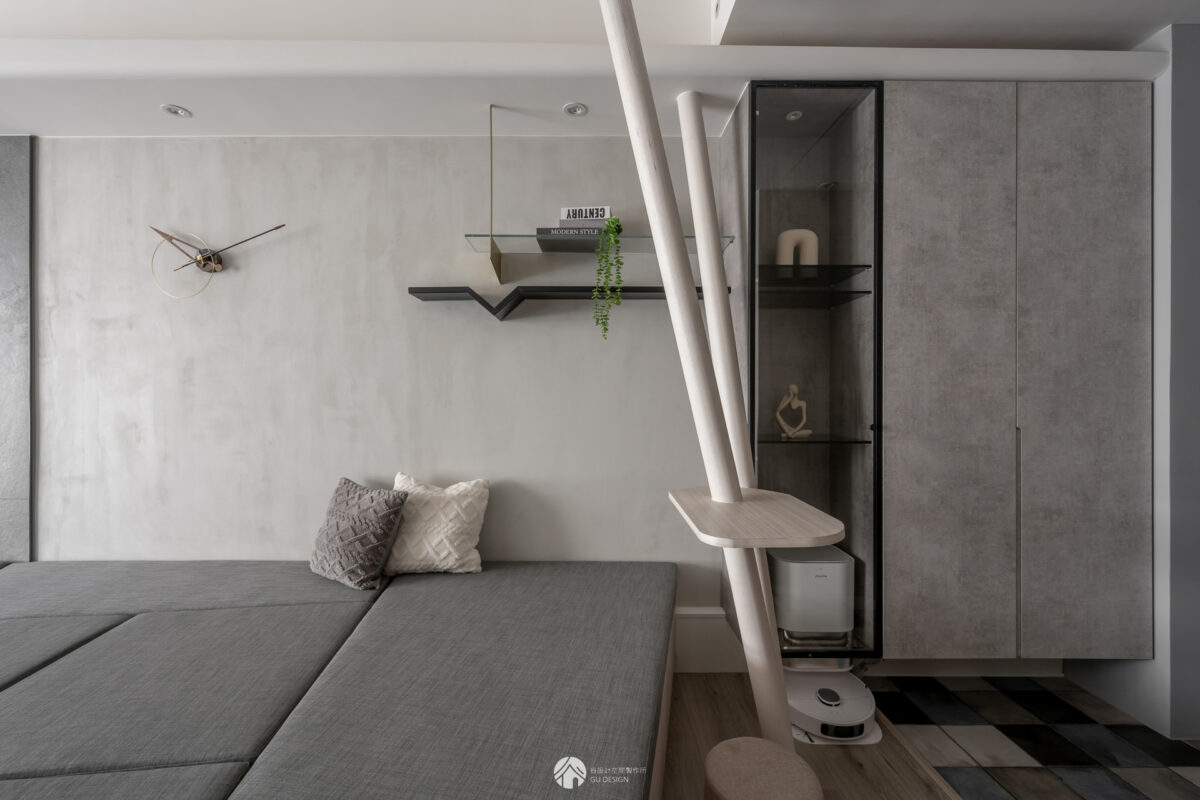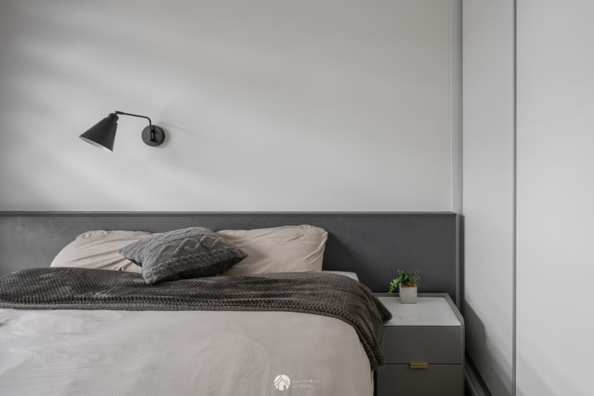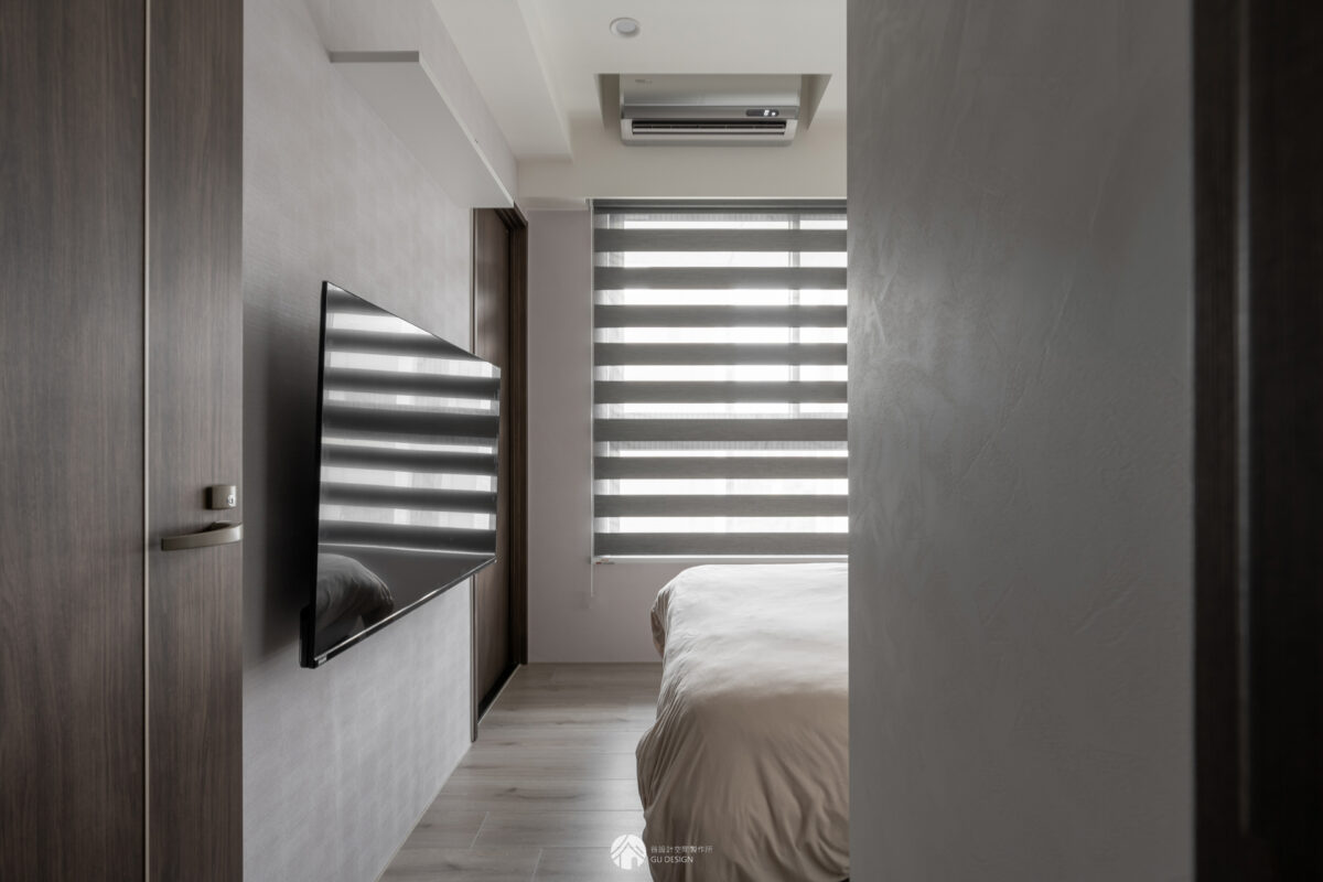 主臥室以俐落的風格為主,沒有太多繁複的設計,僅保留系統衣櫃、電視和上方層架,減少空間被壓縮和生活碰撞的危險性,讓空間回到純粹的休憩功能。