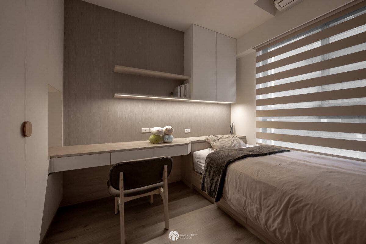 次臥室因應書桌與收納的需求,將床鋪、書桌和系統櫃整合成一體成型的設計,增加可利用的空間。從床鋪延伸到書桌的情境燈光,以均勻、柔和的亮度打造舒適的燈光環境,也能兼做閱讀照明。搭配調光簾、原木色點綴,呈現溫潤、和諧的氣氛。